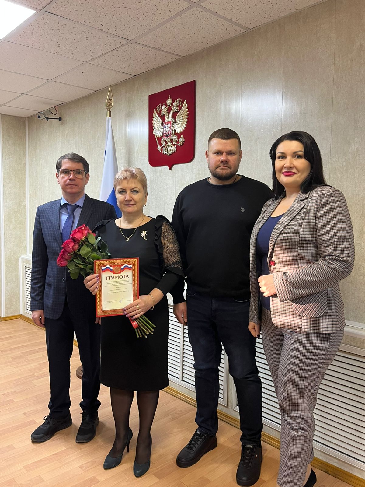 19 декабря 2024 г. на оперативном совещании председатель Левобережного районного суда г. Воронежа Сергей Иванович Бойченко совместно с заместителями поздравили старшего специалиста 1 разряда Извекову Валентину Ивановну с 60-летием и пожелали крепкого здоровья, успехов во всех начинаниях и исполнения всех заветных желаний. Валентина Ивановна награждена почетной гр |